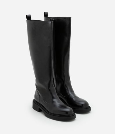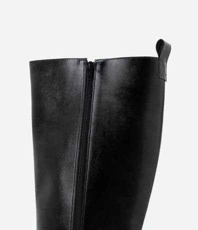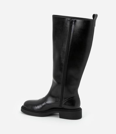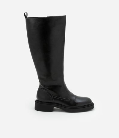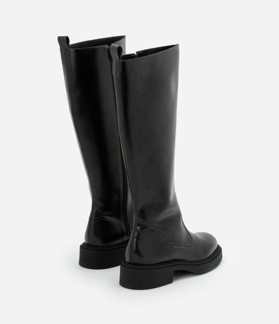 Bota feminina confeccionada em material sintético, com cano alto e largo, sem estampa e com sola pesada. Possui bico redondo, salto médio de 5cm e fechamento por zíper.