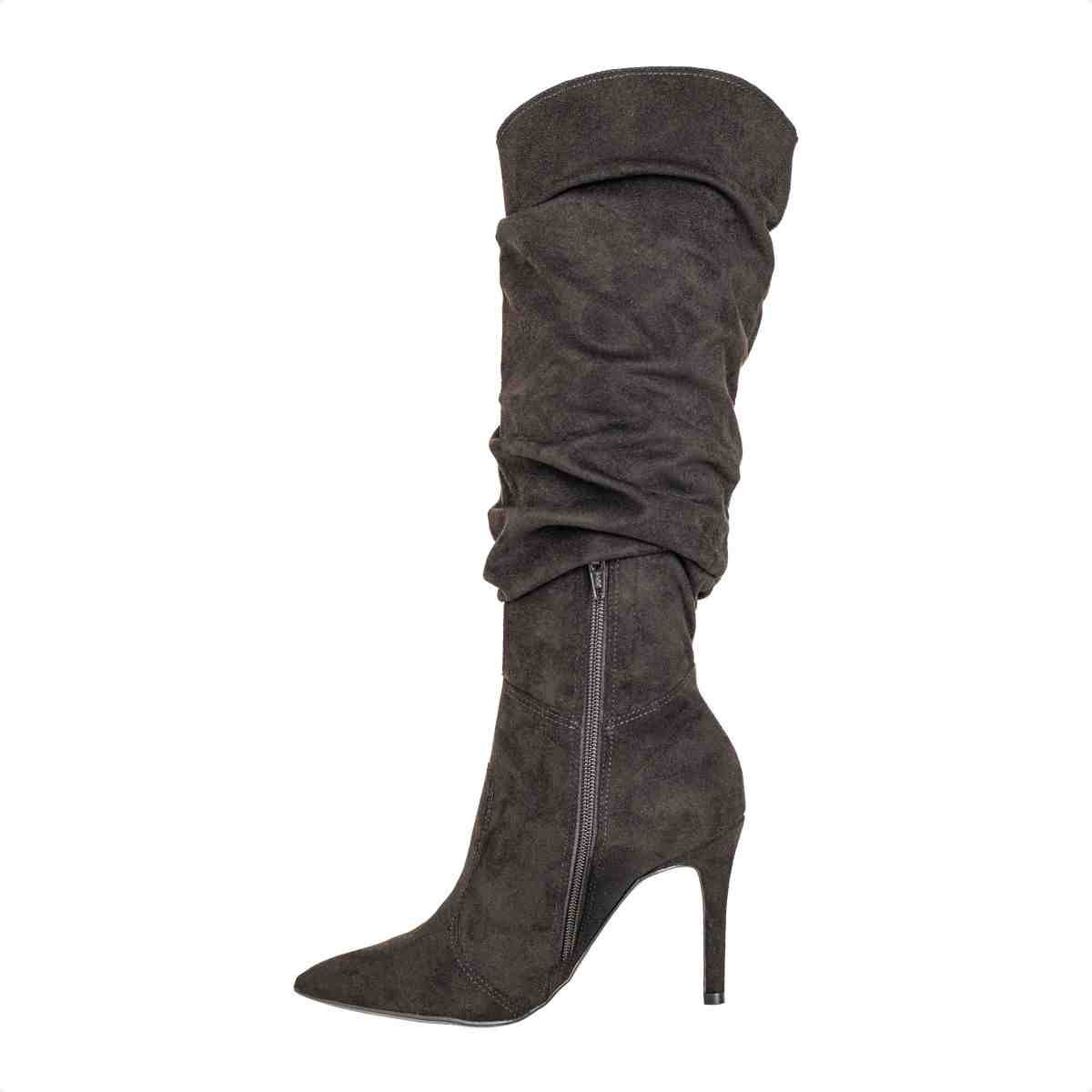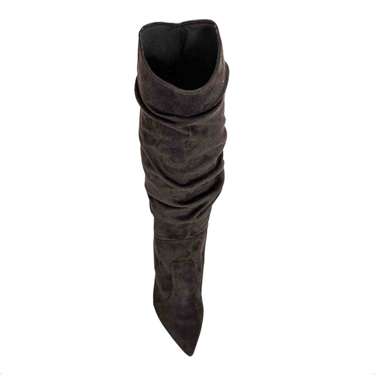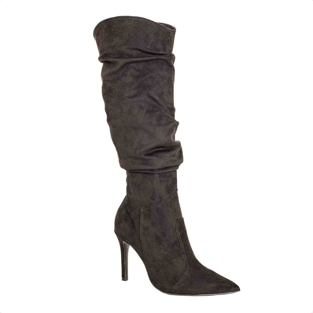 Confeccionada em camurça stretch, o material possui textura aveludada e leve elasticidade, proporcionando melhor adaptação à perna e ajuste mais confortável. A cor preta reforça a versatilidade e elegância do modelo.