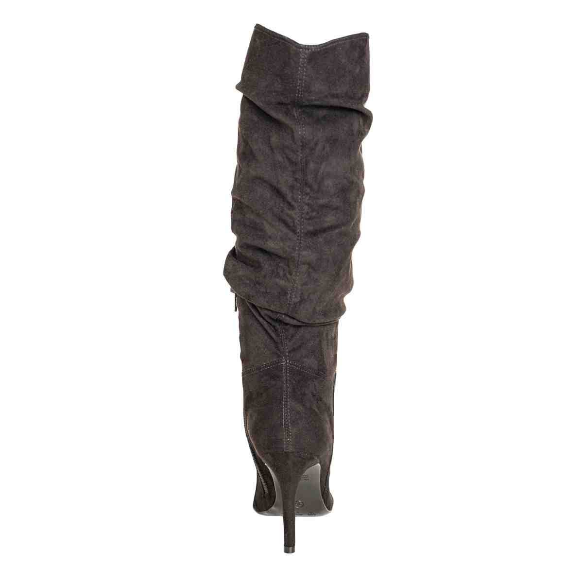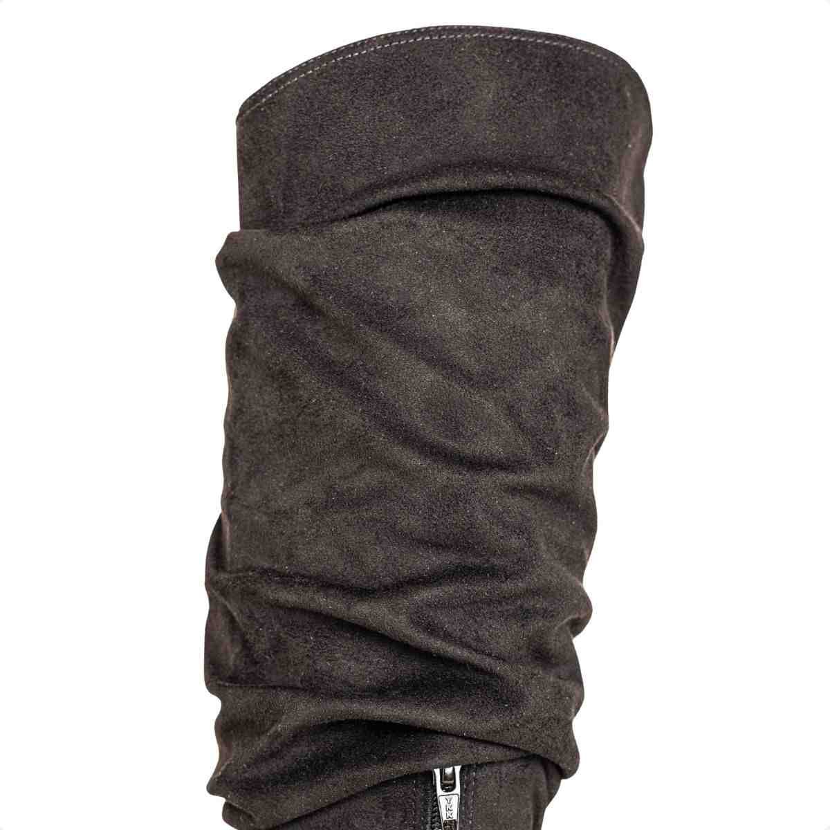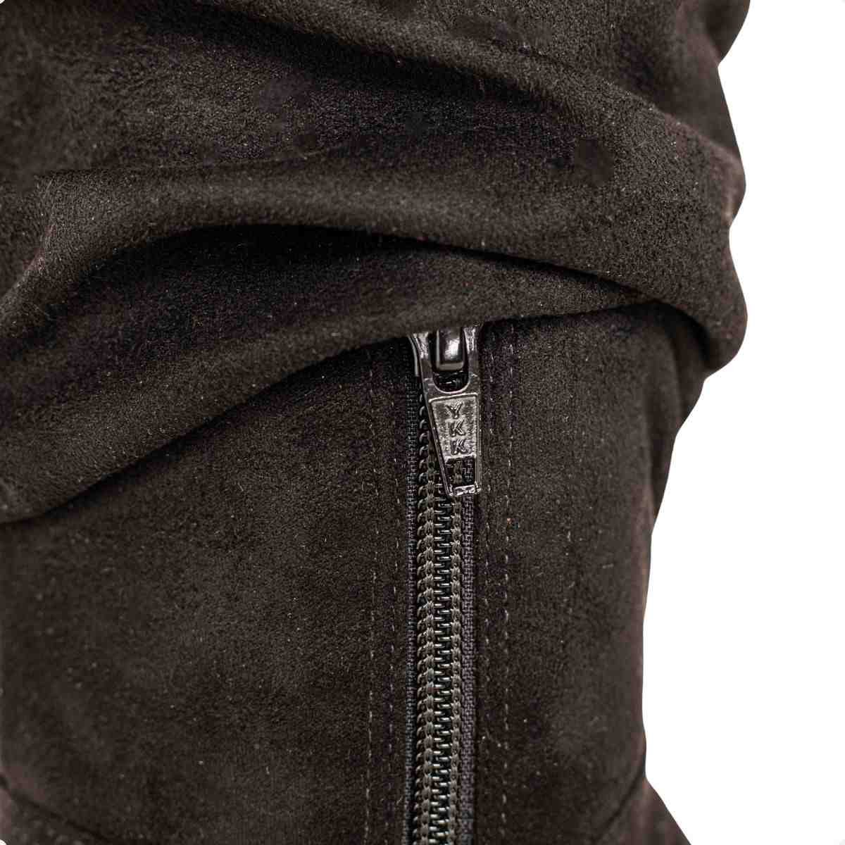 Confeccionada em camurça stretch, o material possui textura aveludada e leve elasticidade, proporcionando melhor adaptação à perna e ajuste mais confortável. A cor preta reforça a versatilidade e elegância do modelo.