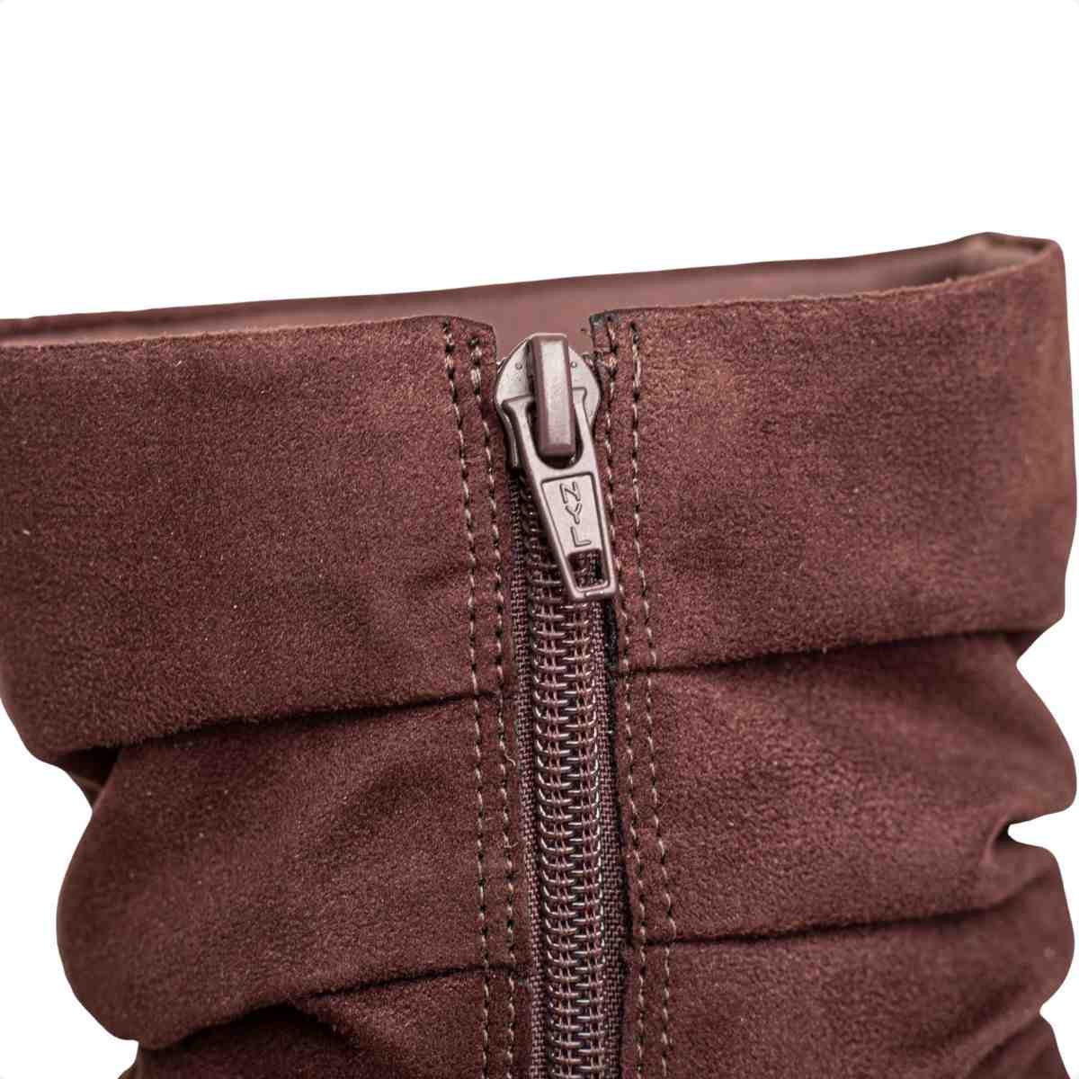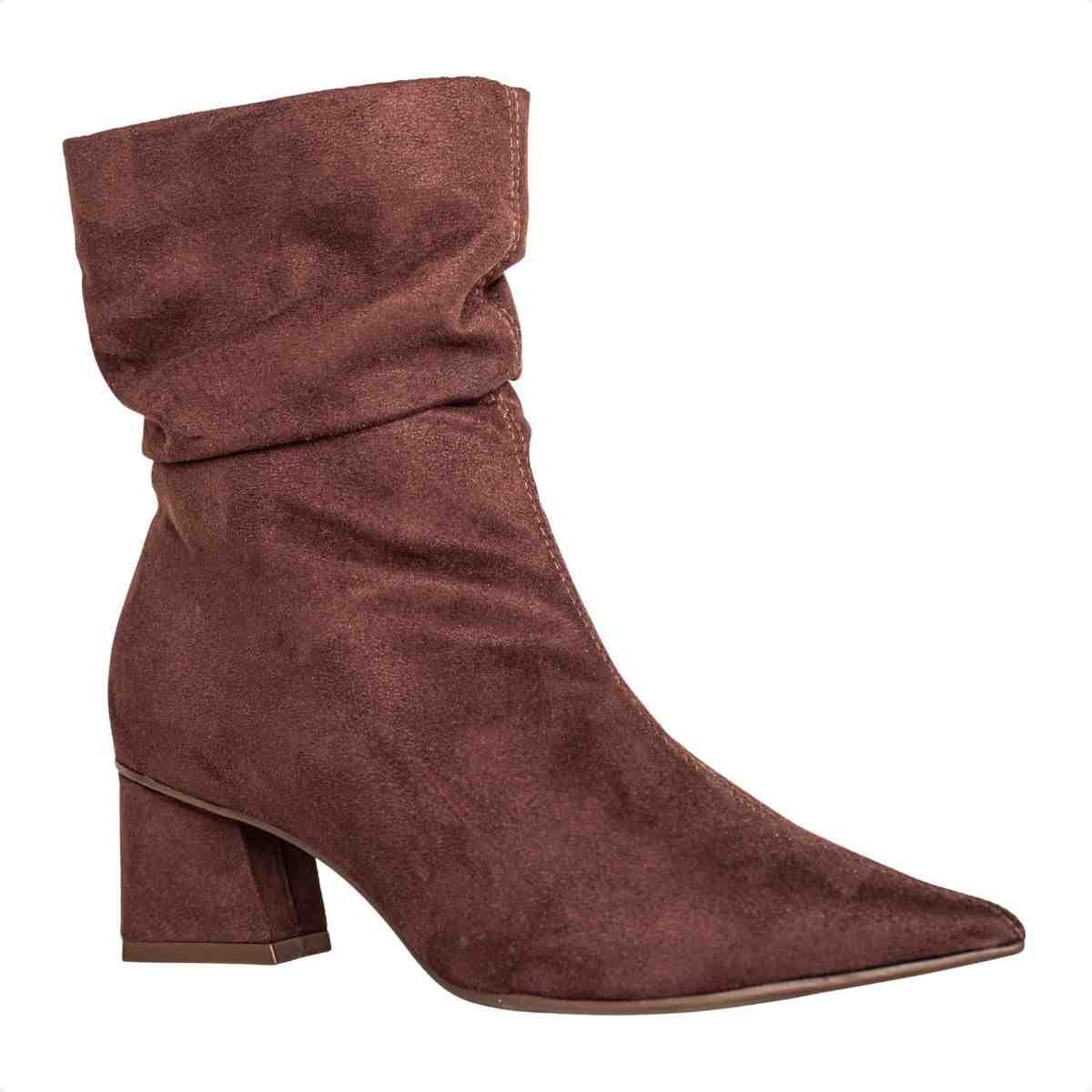 O design apresenta efeito levemente franzido no cano, trazendo um toque contemporâneo e estiloso. O salto bloco revestido em camurça suede mantém o acabamento uniforme, enquanto a cor cacau adiciona sofisticação e versatilidade às combinações.