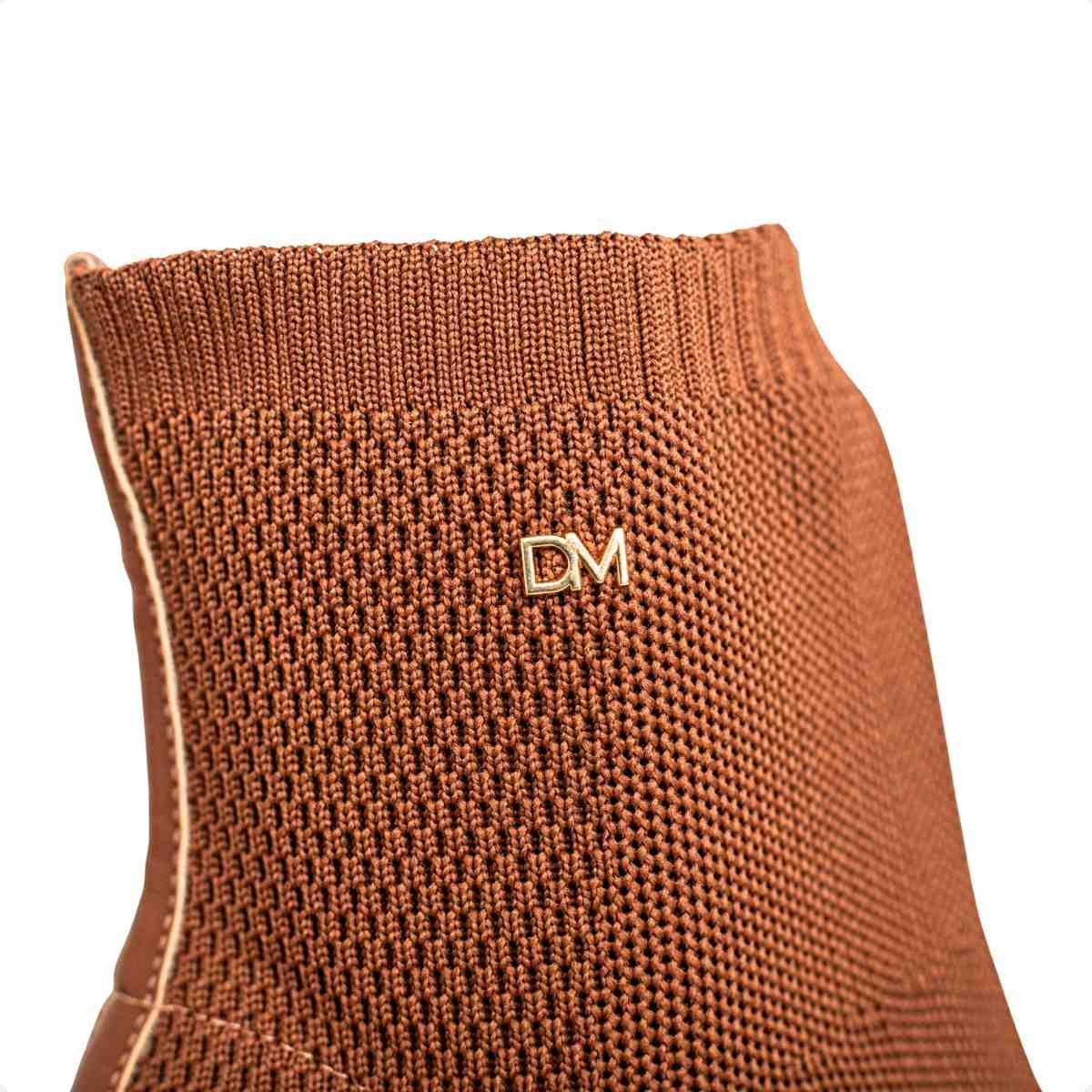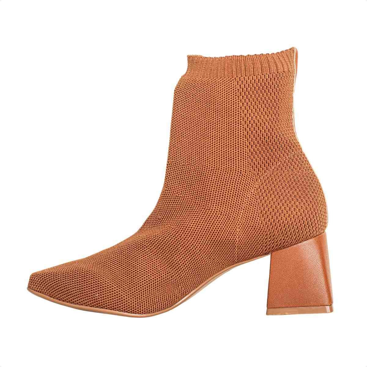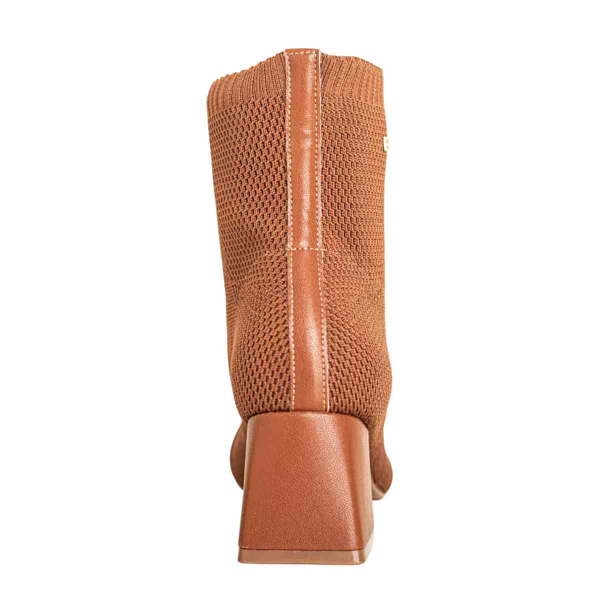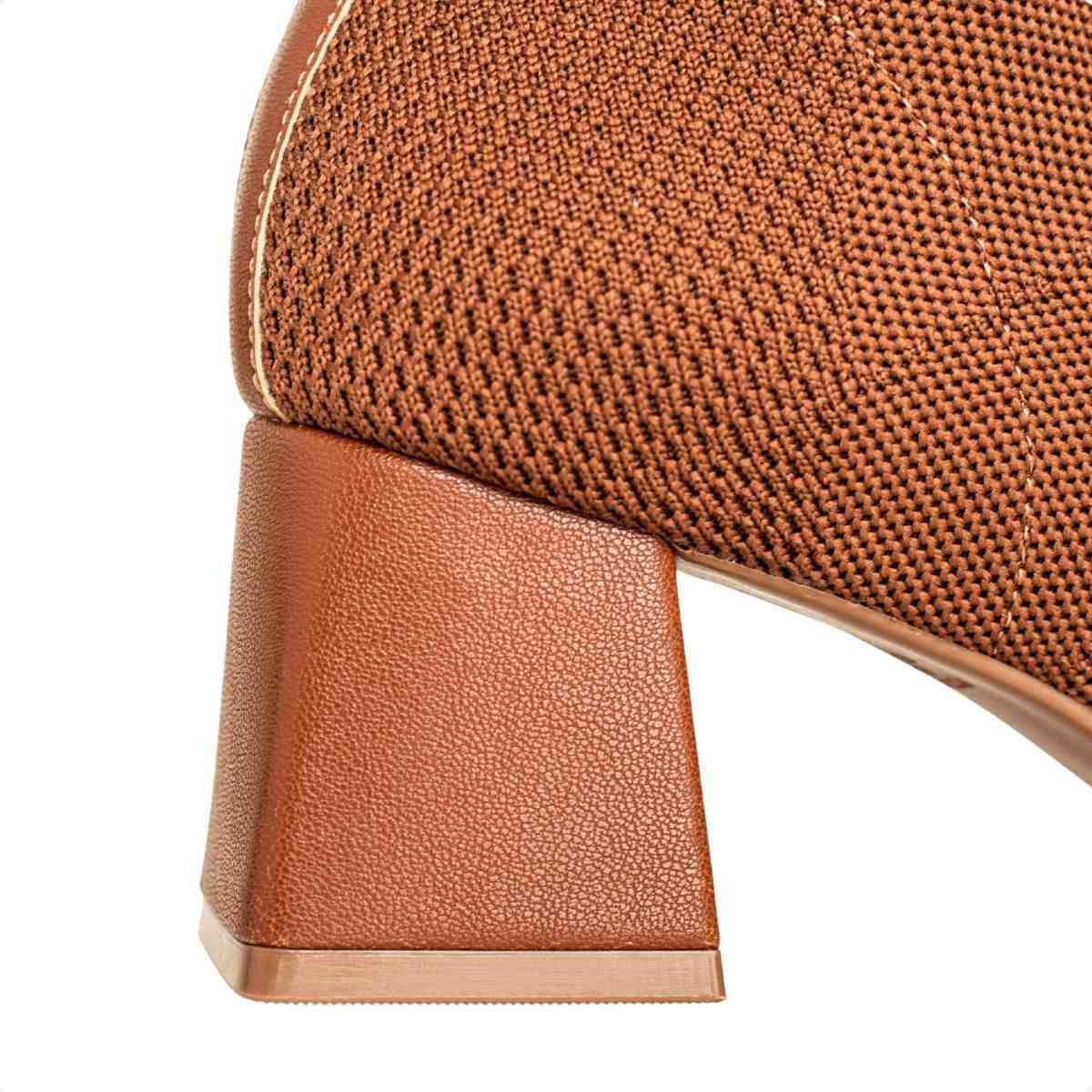 O design é moderno e equilibrado, com salto bloco revestido em napa soho, criando um visual harmônico. A tonalidade tiramissu adiciona personalidade ao look, mantendo fácil combinação com peças neutras e tons terrosos.