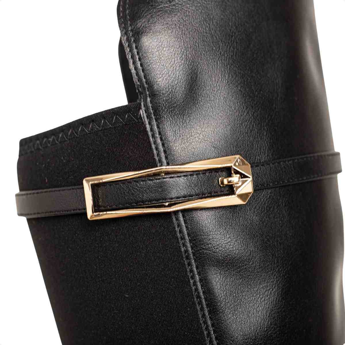 Produzida em napa rústica, material resistente com leve textura, combinada ao tecido new lycra, que proporciona ajuste mais anatômico na panturrilha. Essa combinação garante conforto, flexibilidade e visual elegante.