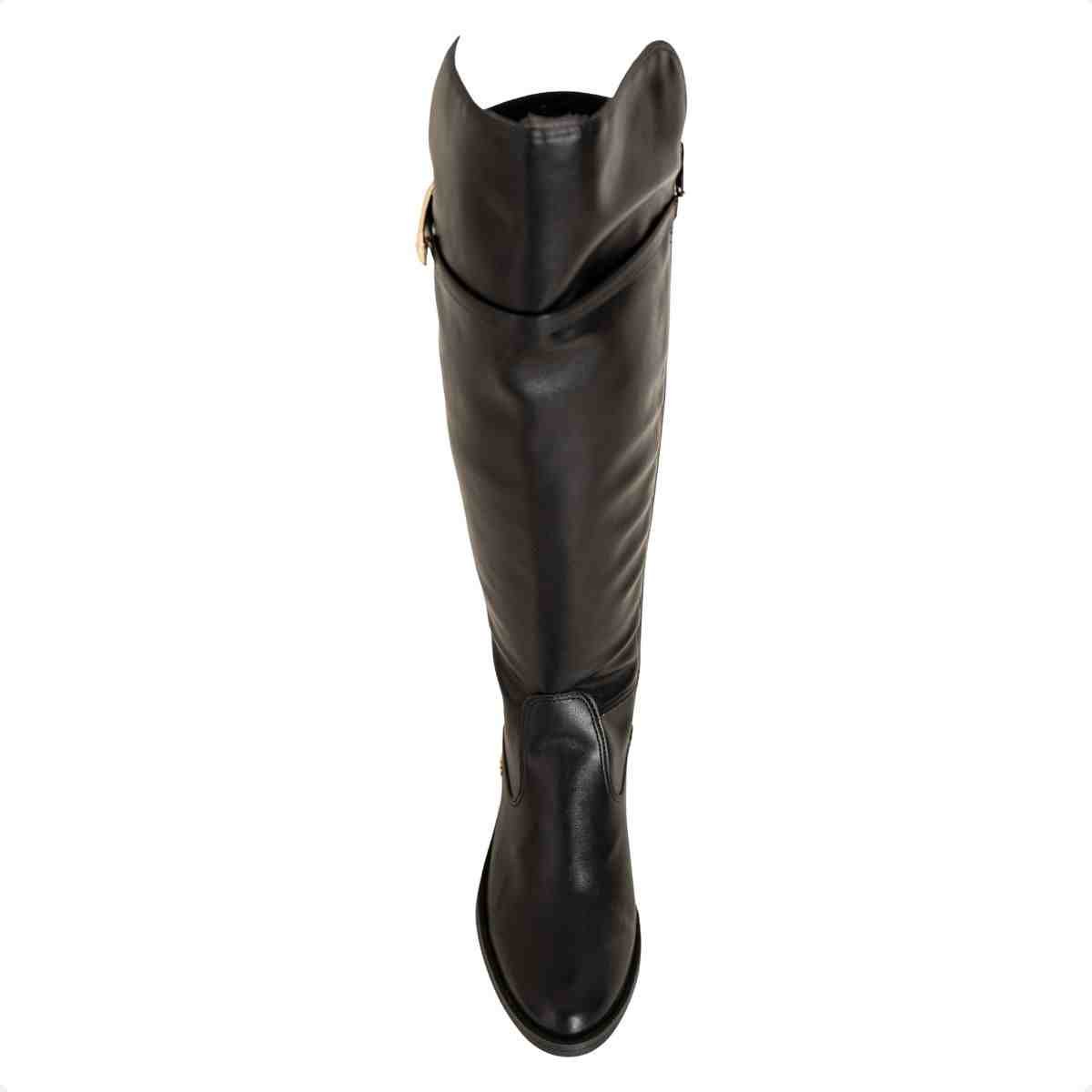 O modelo clássico de bota montaria feminina traz detalhe de fivela decorativa na parte superior do cano e aplicação metálica discreta na lateral, agregando sofisticação ao visual.