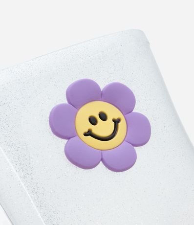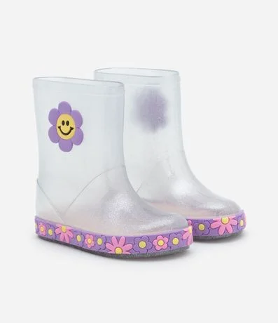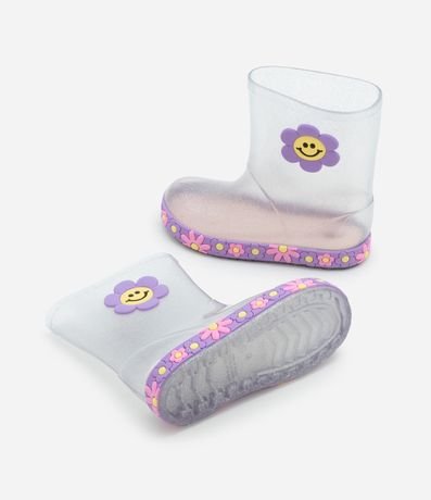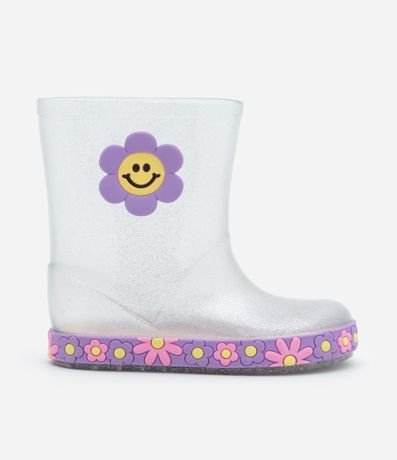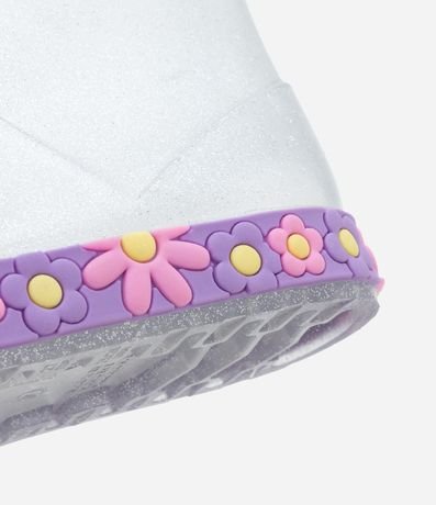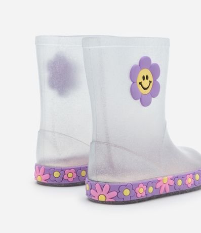 Galochinha infantil confeccionada em pvc transparente, com glitter e de cano médio. Possui patch de florzinha na lateral e solado florido também.