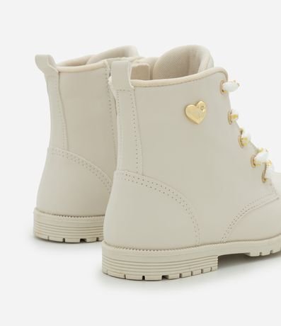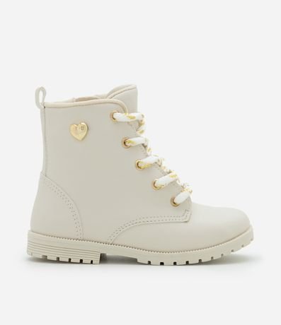 Bota infantil confeccionada em PU resistente, com visual moderno e calce confortável. Possui cano médio, fechamento por zíper lateral, cadarço com fios dourados e ilhós metálicos. Traz aplique lateral e solado tratorado antiderrapante, garantindo estabilidade no dia a dia.