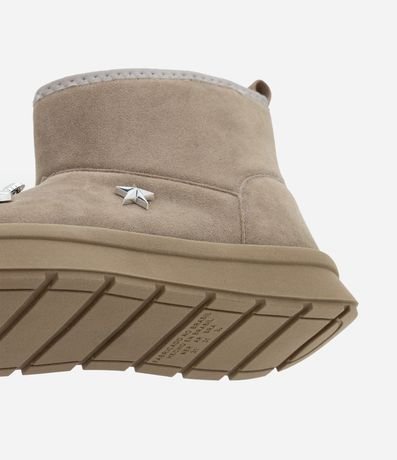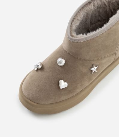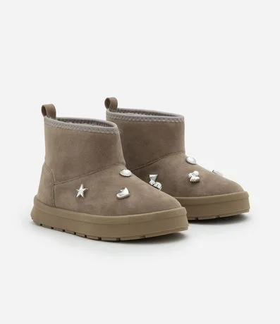 Bota infantil confeccionada em material macio com textura tipo camurça e interior totalmente peluciado para maior conforto térmico. Possui cano curto estruturado, puxador traseiro para facilitar o calce e pins decorativos aplicados no cabedal.