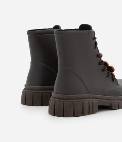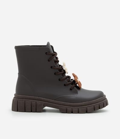 Ref: Bota infantil estilo coturno confeccionada em PVC com estrutura reforçada. Possui cano médio, solado tratorado robusto e cadarço com apliques decorativos em formato de flores, que adicionam charme ao visual. Modelo confortável e resistente.