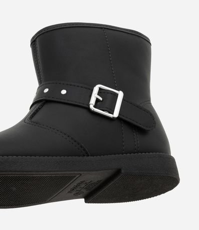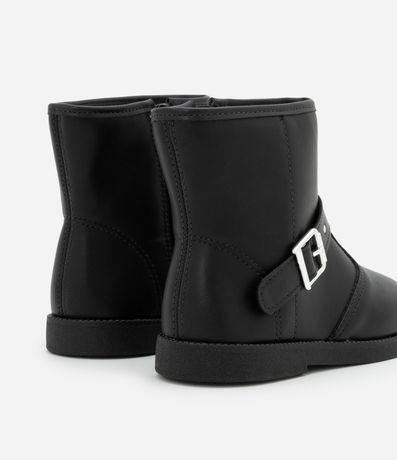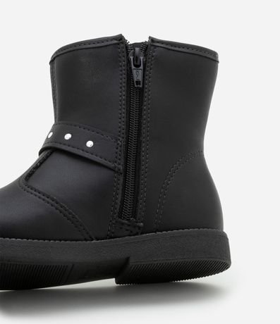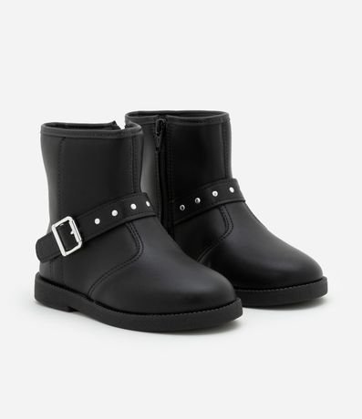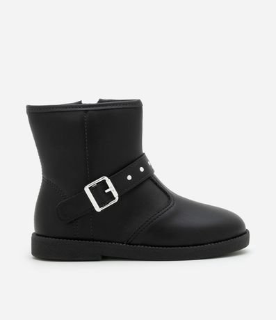 Ref: Bota infantil com cano médio, fechamento lateral por zíper, bico redondo, detalhe de tira e fivela.
