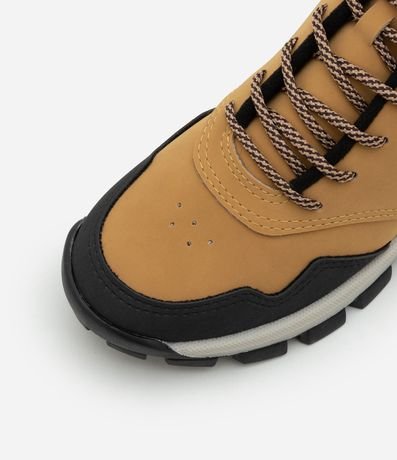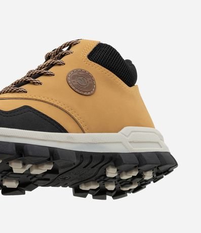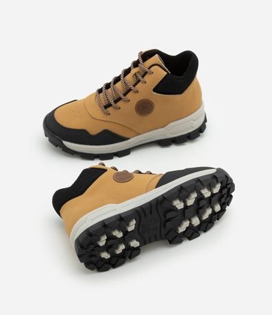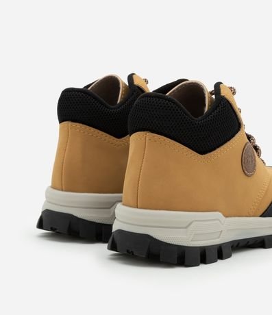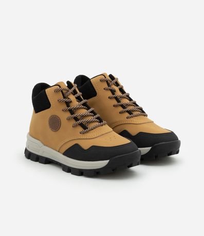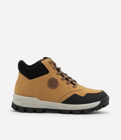 Ref: Bota infantil confeccionada em material sintético. O calçado tem cadarços, recortes contrastantes, bico redondo e sola tratorada.