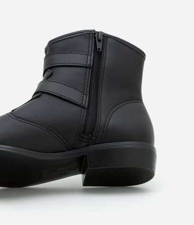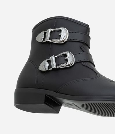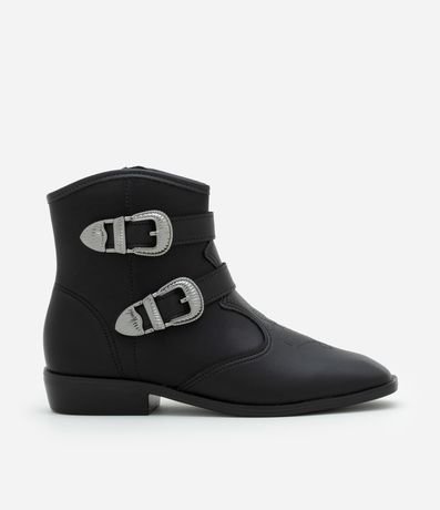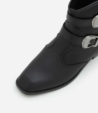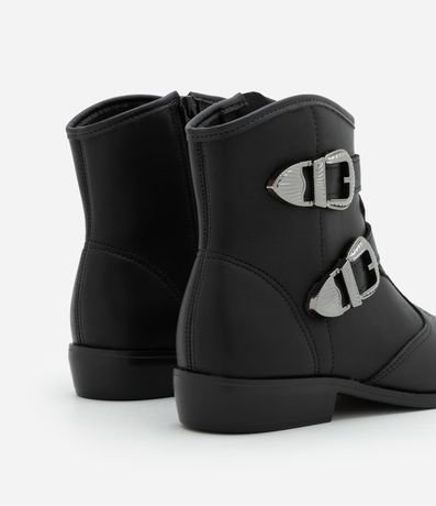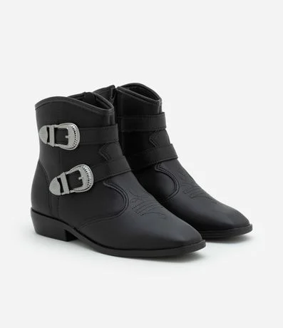 Ref: Bota infantil de modelo western, com cano médio, fechamento lateral por zíper, bico redondo, detalhe de tiras e fivelas.