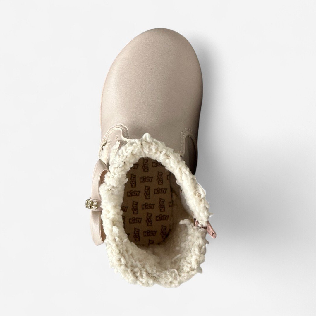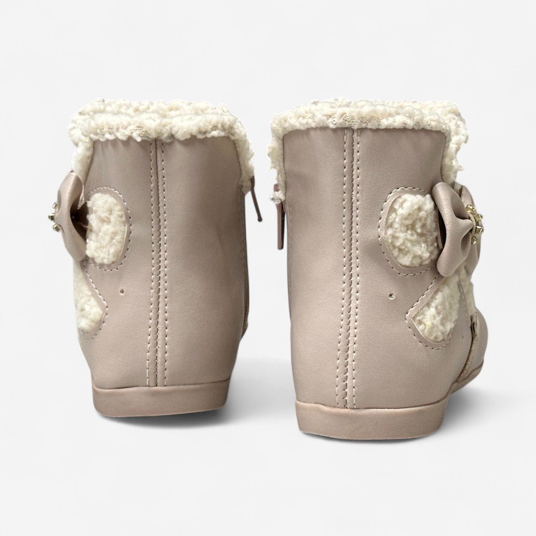 Detalhes: laço decorativo na lateral, pelinhos internos, zíper interno para facilitar o calce
