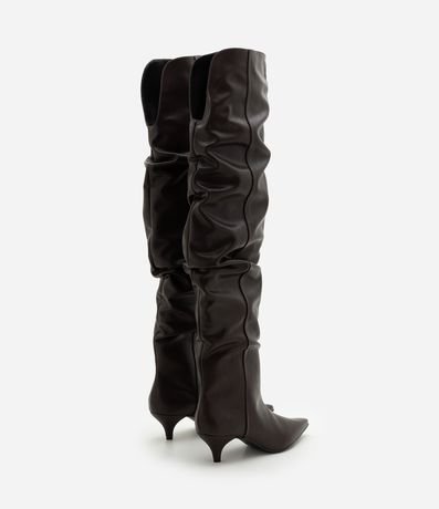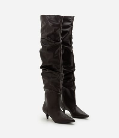 Ref: Bota feminina confeccionada em material sintético, de modelo over the knee e com salto kitten heel. Possui efeito slouchy, com caimento franzido ao longo do cano.