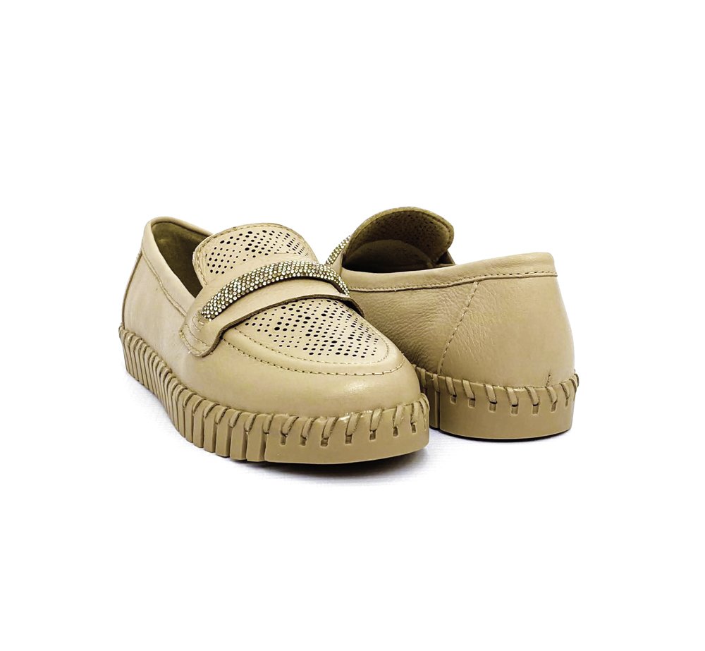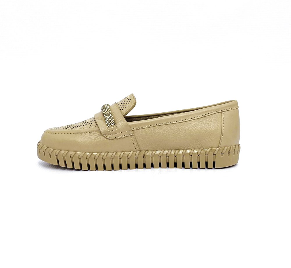 Ref: Sapato mocassim em couro o modelo traz o equilíbrio perfeito entre elegância e conforto. Solado rasteiro na cor natural e bico arredondado. Possui delicado detalhe com strass sobre o pé. Praticidade em um único item.