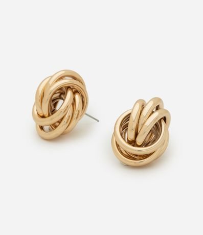 Ref: Brinco feminino em metal com modelo botão e formato de nó entrelaçado, composto por hastes arredondadas. Possui acabamento polido e tamanho médio, ideal para uso diário e composições casuais.