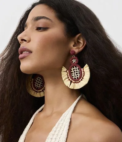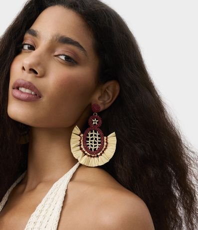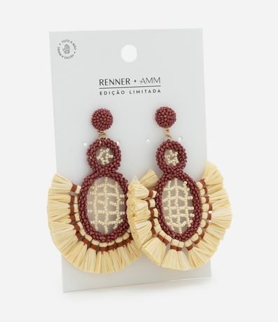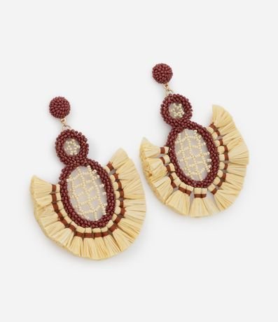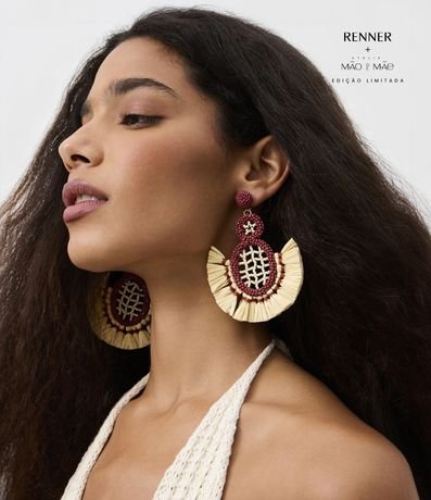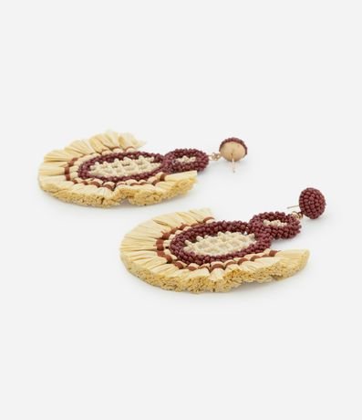 Ref: Brinco médio com efeito ráfia e miçangas, design geométrico artesanal, fechamento por tarraxa e composição que une fibras naturais, garantindo estilo moderno e toque sustentável para looks cheios de personalidade.