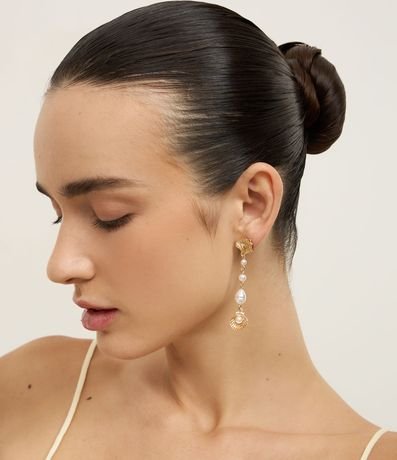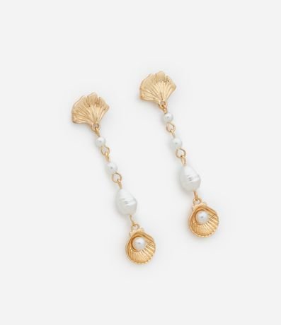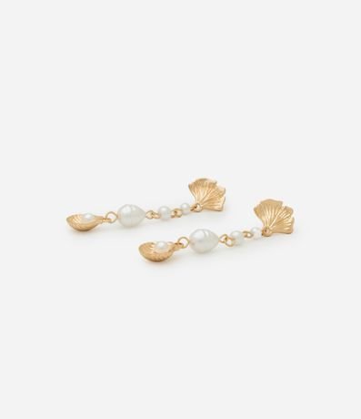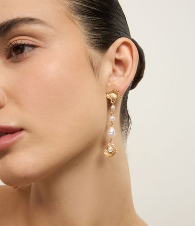Ref: Brinco fio feminino traz pérola sintética e pingente de concha com banho light gold, combinando delicadeza e estilo.