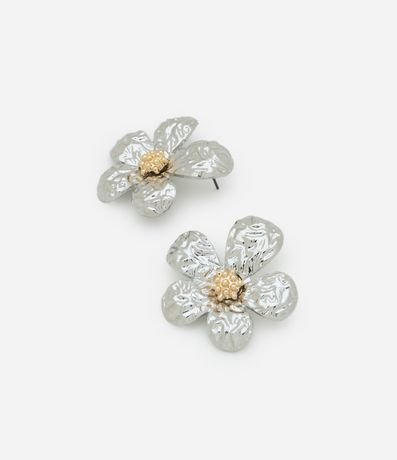 Ref: Brinco grande em metal com forma de botão de flor com miolo contrastante, fechamento por tarraxa e efeito martelado.