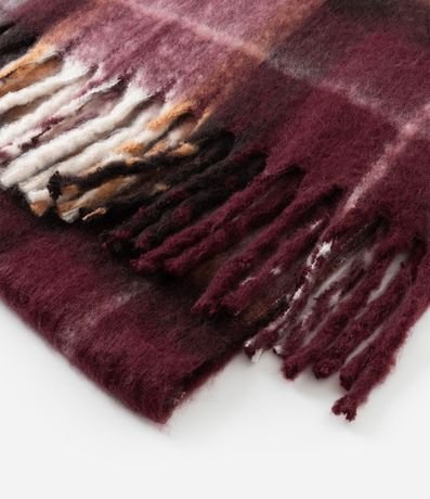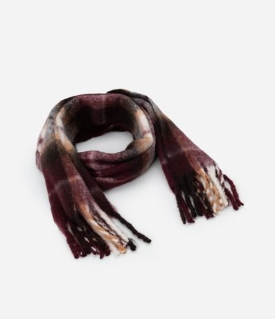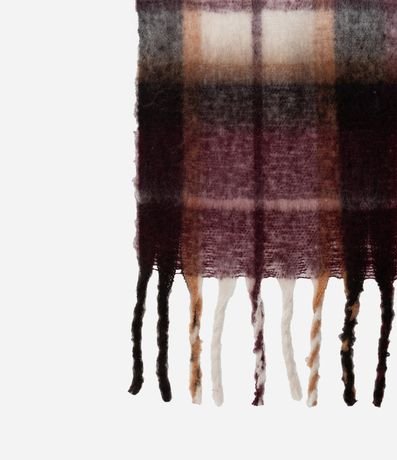 Cachecol feminino confeccionado em tricô, possui estampa xadrez e franjas.
