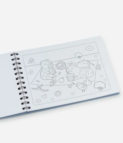 Caderno confeccionado em papel, para colorir, com espiral e estampa de capivaras.