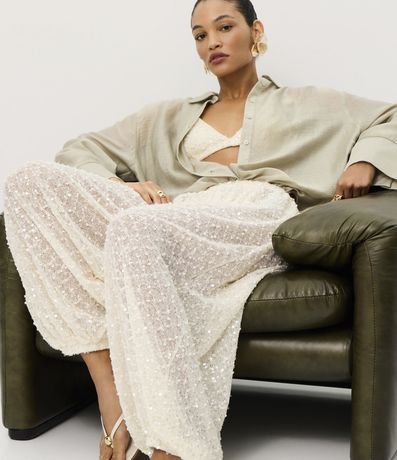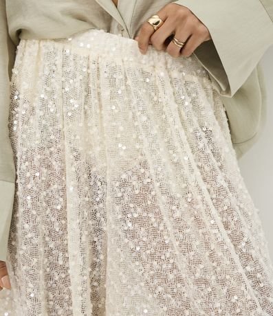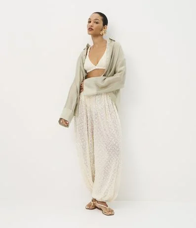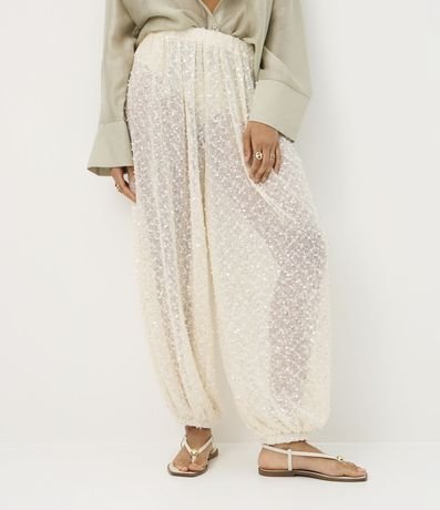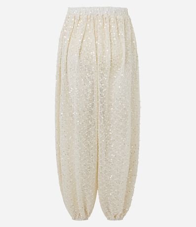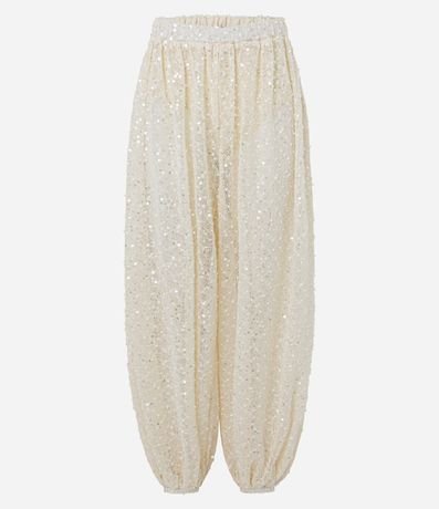 Ref: Calça aladim balloon de cintura alta, confeccionada em tricô com aspecto de tela, com elástico no cós e nos tornozelos. Peça com paetês aplicados e forro.