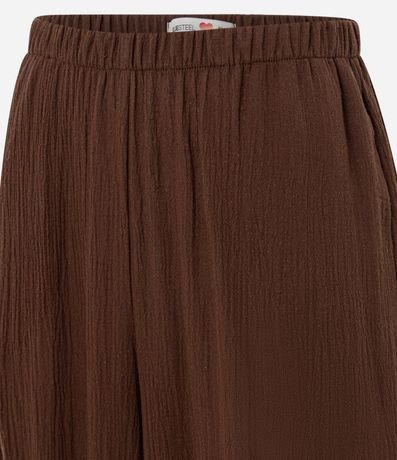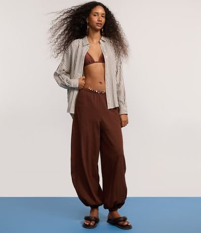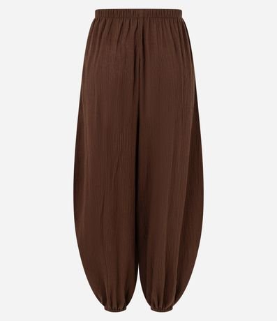 Ref: Calça feminina confeccionada em algodão certificada bci, peça no modelo aladim com cós elástico e barra ajustada.