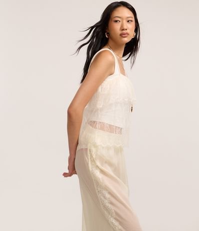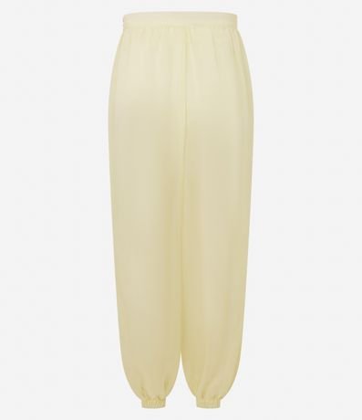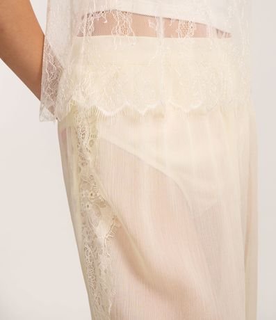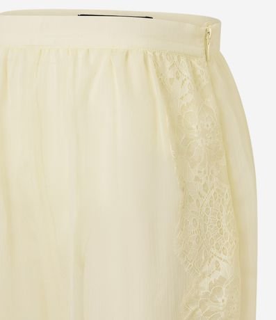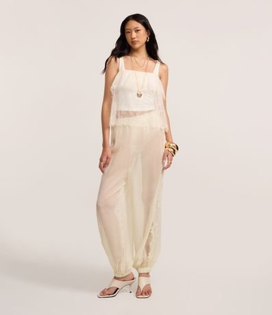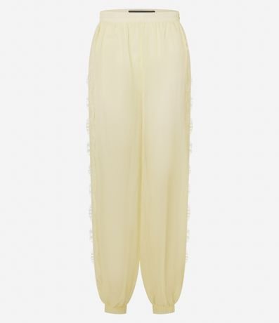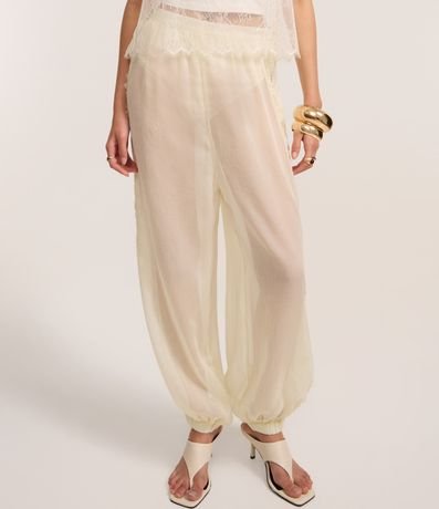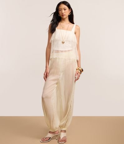 Calça aladim, confeccionada em chiffon, com fechamento lateral por zíper e renda lateral.