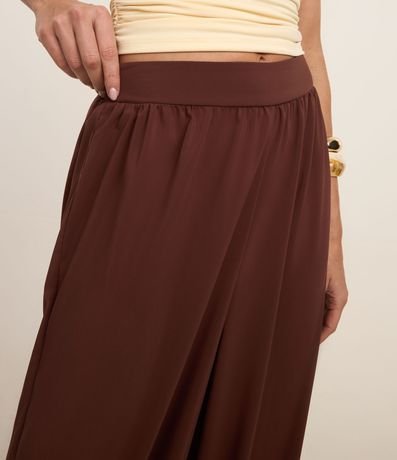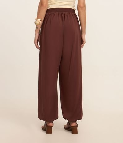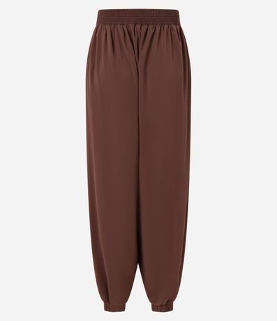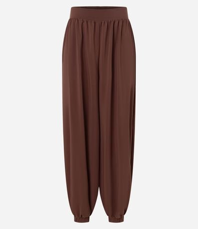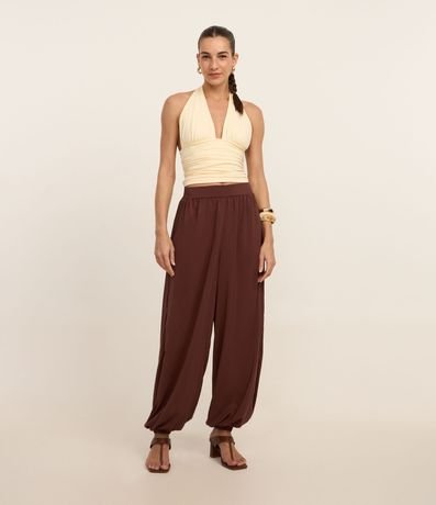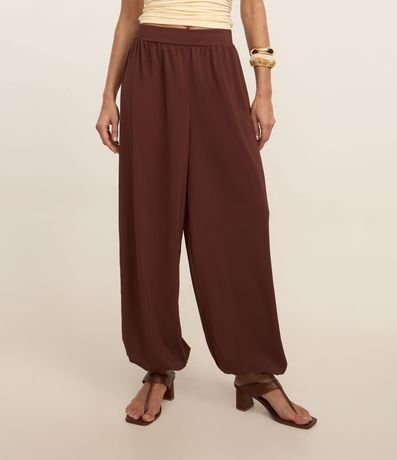 Calça aladim, confeccionada em crepe com elastano, cós largo com elástico e pregas na cintura.