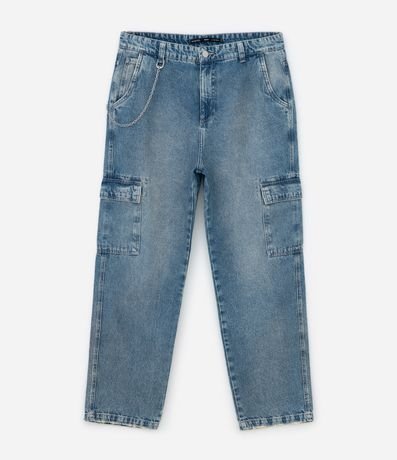 Ref: Calça masculina no modelo baggy, em jeans com bolsos cargo laterais e corrente removível. Modelagem ampla e confortável, ideal para compor looks casuais com personalidade. Confeccionado em algodão de certificado BCI, reforçando compromisso com práticas mais sustentáveis.