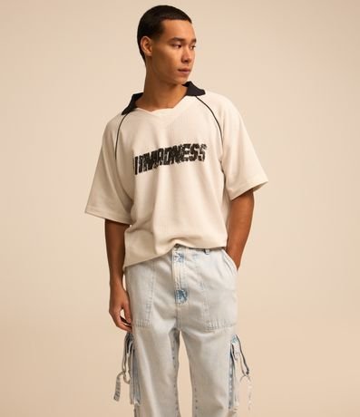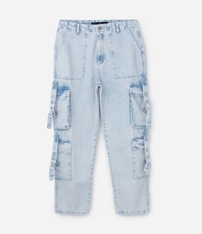 Calça masculina confeccionada em jeans, de modelo baggy, com passantes no cós e bolsos faca. Possui diferencial de bolsos cargo nas laterais com fivelas e fechamento frontal com botão e zíper.
