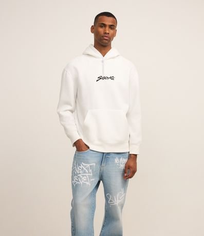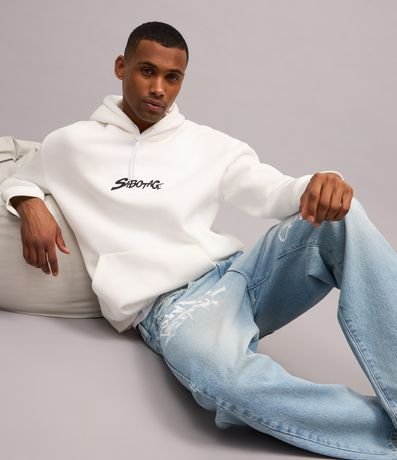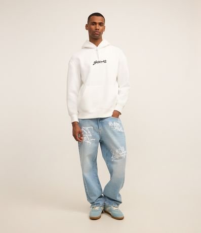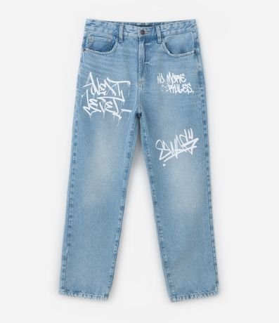 Ref: Calça masculina em jeans, cós com passantes, fechamento tradicional por botão e zíper, bolsos. Peça no modelo baggy com puídos e estampa grafite.