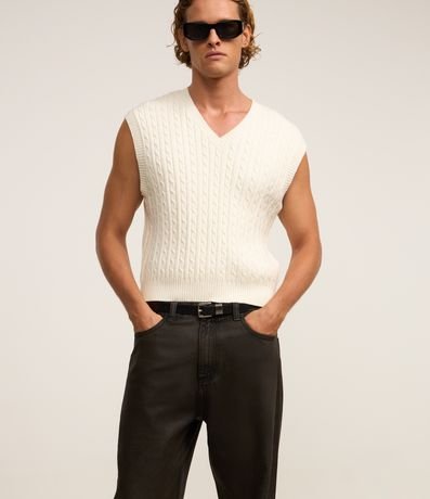 Calça masculino confeccionada em jeans resinada, no modelo reta, cós com passante, fechamento por botão e zíper e bolsos.