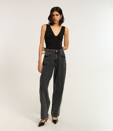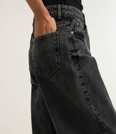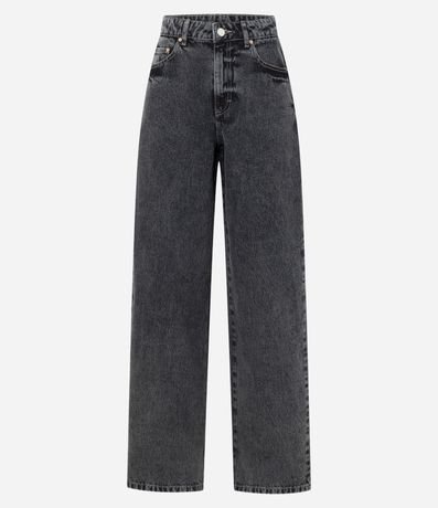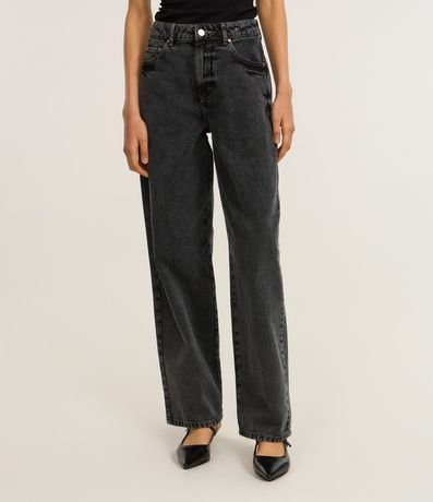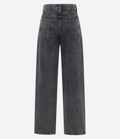 Calça jeans feminina de modelo baggy, com passantes no cós e bolsos. Possui fechamento frontal tradicional e marcas rajadas na perna.