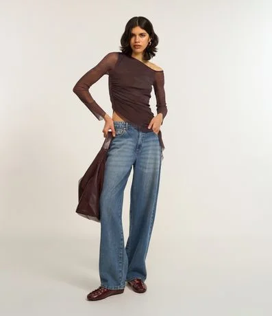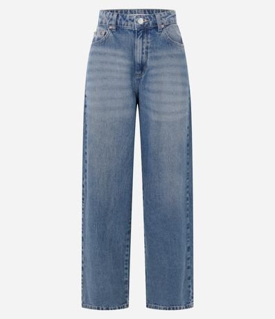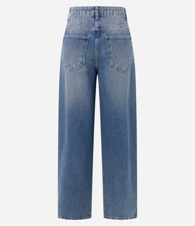Calça jeans feminina de modelo baggy, com passantes no cós e bolsos. Possui fechamento frontal tradicional e marcas rajadas na perna.