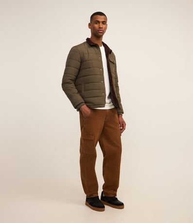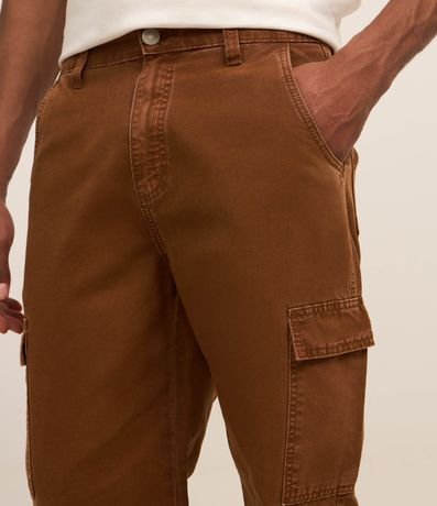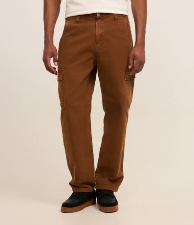 Calça masculina confeccionada em sarja mais sustentável, cós com passantes, fechamento por botão e zíper. Peça com diversos bolsos, no modelo baggy com bolso lateral cargo.
