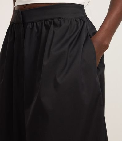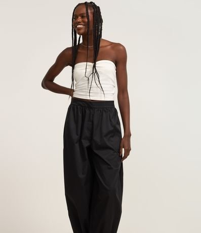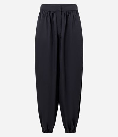 Ref: Calça balloon, elástico na barra e no cós com amarração funcional, pregas na cintura e sem estampa.