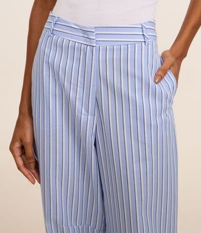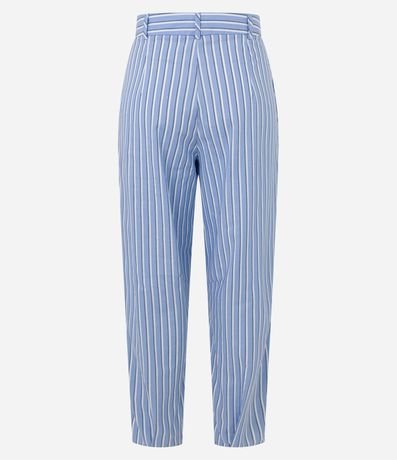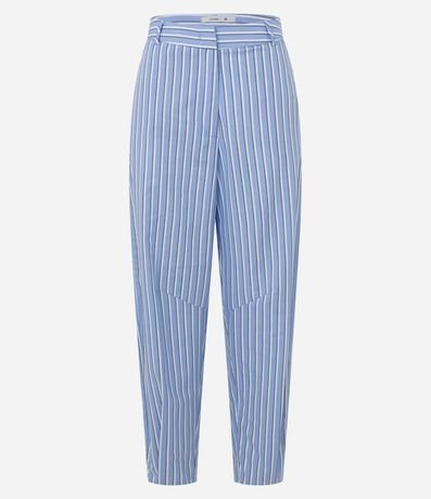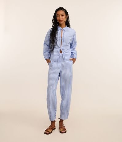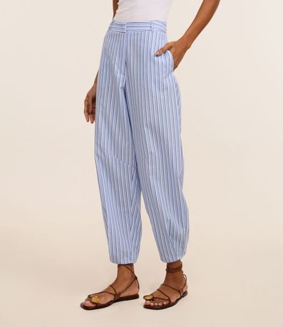 Ref: Calça feminina confeccionada em tricoline de algodão certificado bci com cintura alta, listras. Peça no modelo balloon cropped com fechamento por vista oculta e passantes.