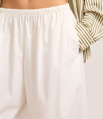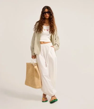 Ref: Calça balloon, confeccionada em tricoline, com elásticos no cós e nos tornozelo. Este produto possui material mais sustentável em sua composição, sendo ambientalmente mais responsável.