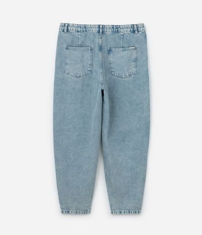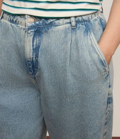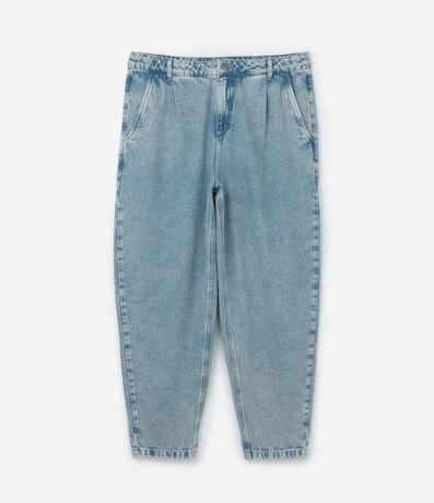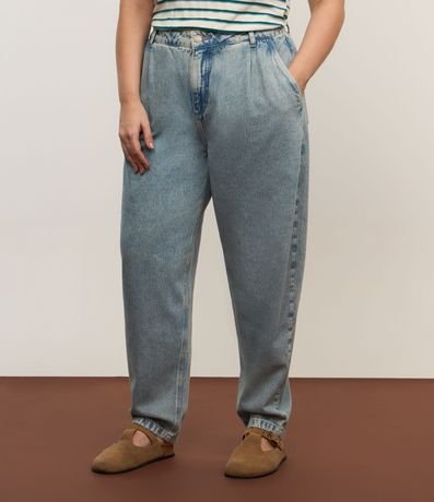Calça feminina Curve & Plus Size confeccionada em Jeans mais sustentável com boas práticas ambientais, peça no modelo Balloon com cós fixo, passantes, fechamento tradicional, pregas e bolsos faca.
