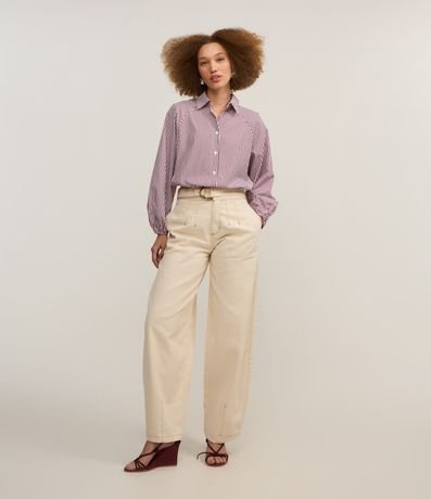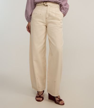 Ref: Calça barrel de cintura alta, confeccionada em jeans com bolsos e pences com costuras aparentes abaixo da cintura e nas barras.