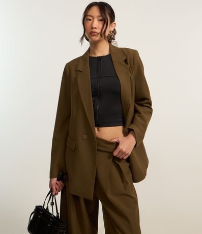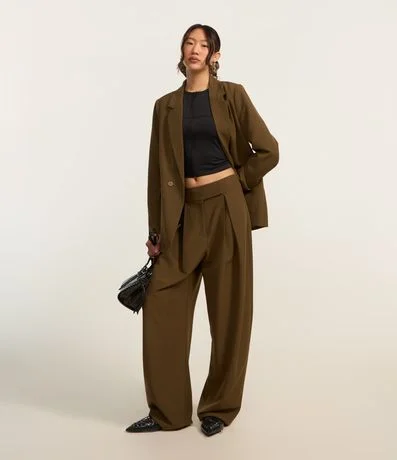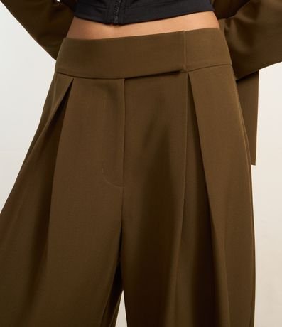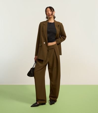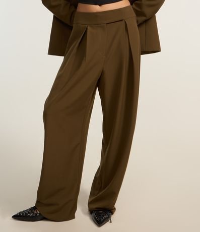 Ref: Calça barrel em alfaiatria, fechamento deslocado no cós liso, pregas frontais e sem estampa.