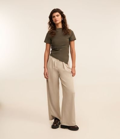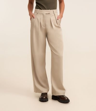 Ref: Calça barrel em alfaiataria com fechamento deslocado, pregas e bolso faca.