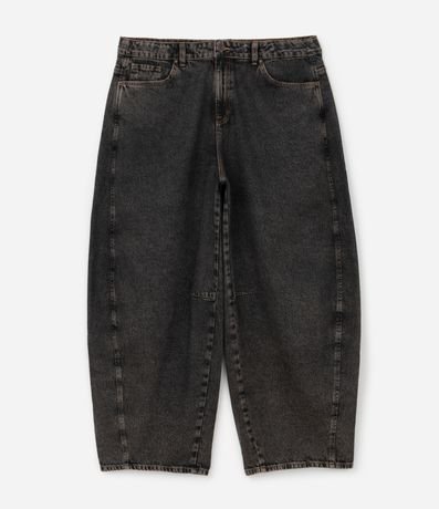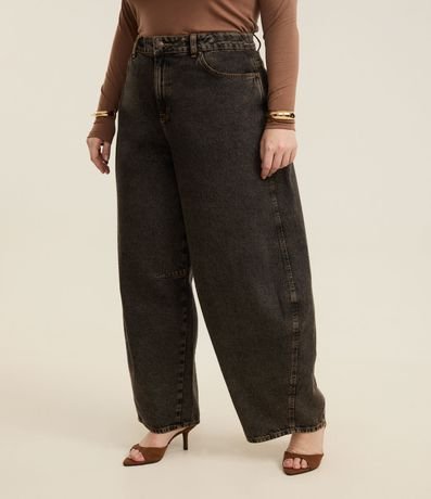 Ref: Calça feminina Curve & Plus Size no modelo barrel confeccionada em jeans de algodão certificado bci com lavagem dirty, peça com cós fixo e passantes, botão interno para ajustes e bolsos.