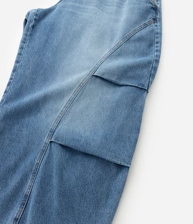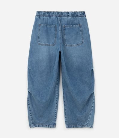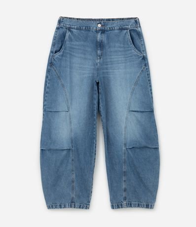 Ref: Calça barrel plus size, confeccionada em jeans, com passantes no cós com elástico atrás, fechamento tradicional, bolsos e recortes e pregas. Este produto possui material mais sustentável em sua composição, sendo ambientalmente mais responsável.