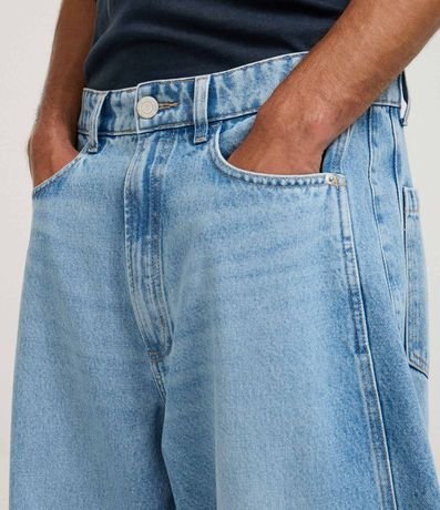 Ref: Calça masculina confeccionada em jeans, cós com passante, fechamento por botão e zíper, bolsos. Peça no modelo barrel, com recortes laterais e pences nos joelhos.