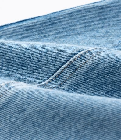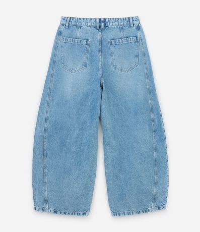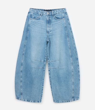 Calça masculina confeccionada em jeans, cós com passante, fechamento por botão e zíper, bolsos. Peça no modelo barrel, com recortes laterais e pences nos joelhos.