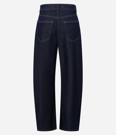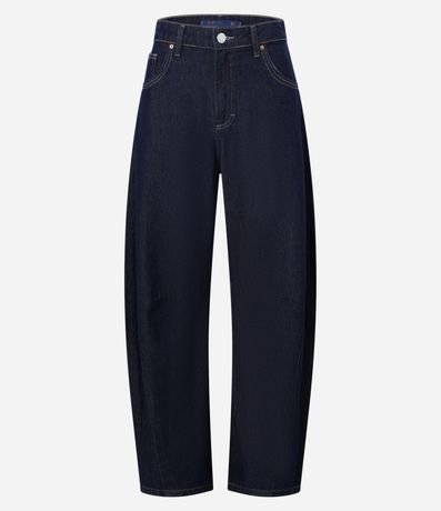 Calça barrel confeccionada em jeans com algdão bci mais sustentável, bolsos e recortes frontais nos joelhos e barra.