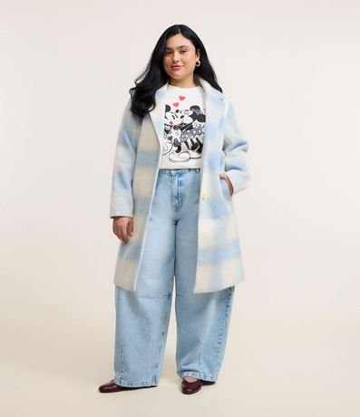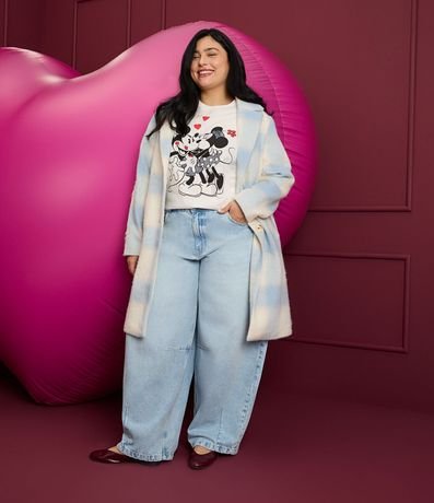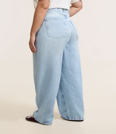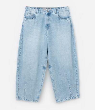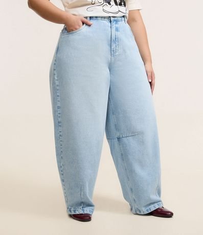 Calça feminina Curve & Plus Size confeccionada em jeans mais sustentável com boas práticas ambientais, peça no modelo barrel com cós fixo, passante, ajuste interno de botão e fechamento tradicional com zíper e botão.