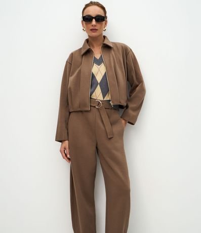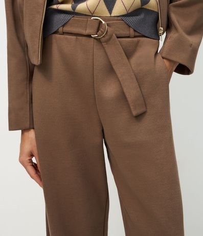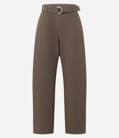 Calça feminina em moletom com felpa, modelagem barrel e caimento estruturado. A frente traz faixa aplicada com fivela metálica.