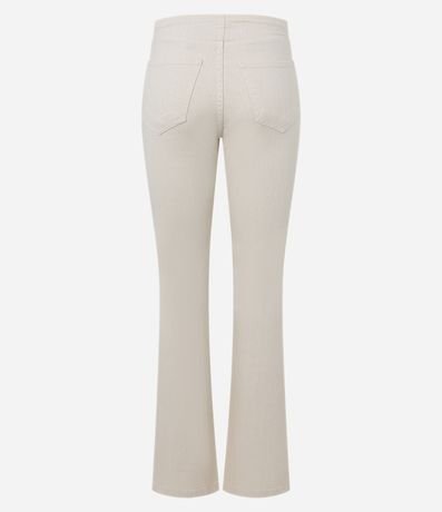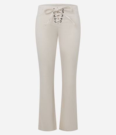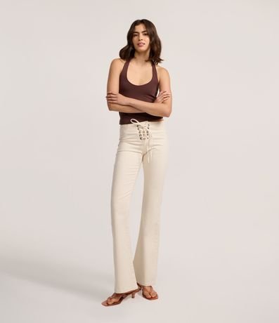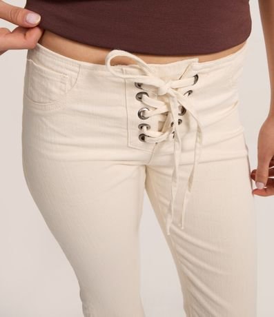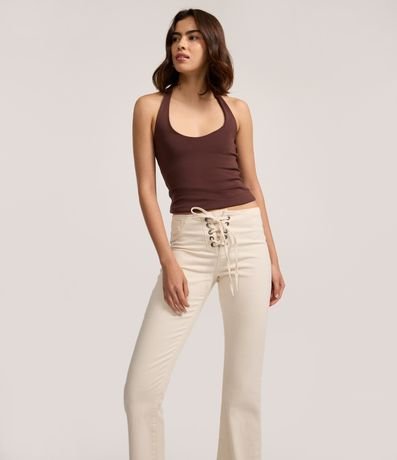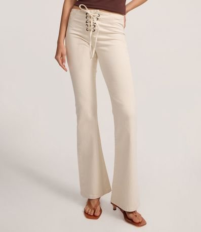 Ref: Calça cintura baixa feminina confeccionada em sarja, de modelo boot cut, sem estampa, com bolsos traseiros e fechamento frontal com amarração trançada.