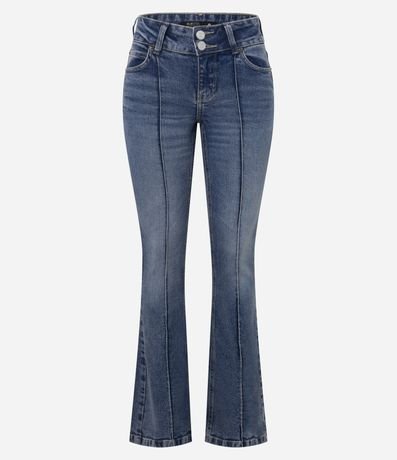 Calça feminina de modelo bootcut, em jeans, com botões duplos no cós e detalhe de nervuras frontais.